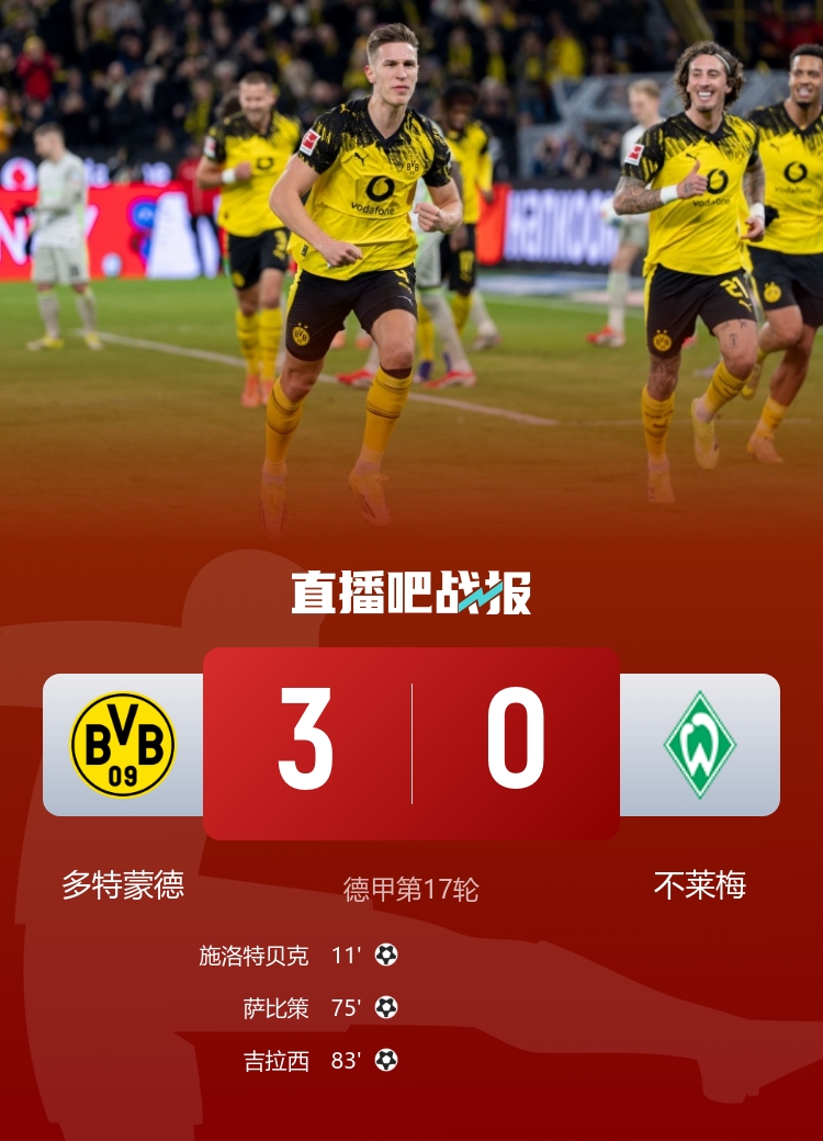 德甲联赛第17轮,多特蒙德3-0战胜不莱梅,施洛特贝克进球。